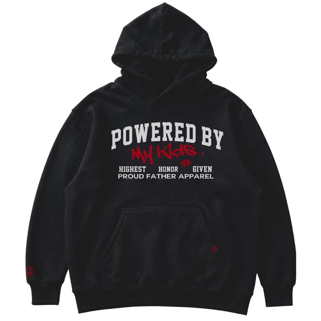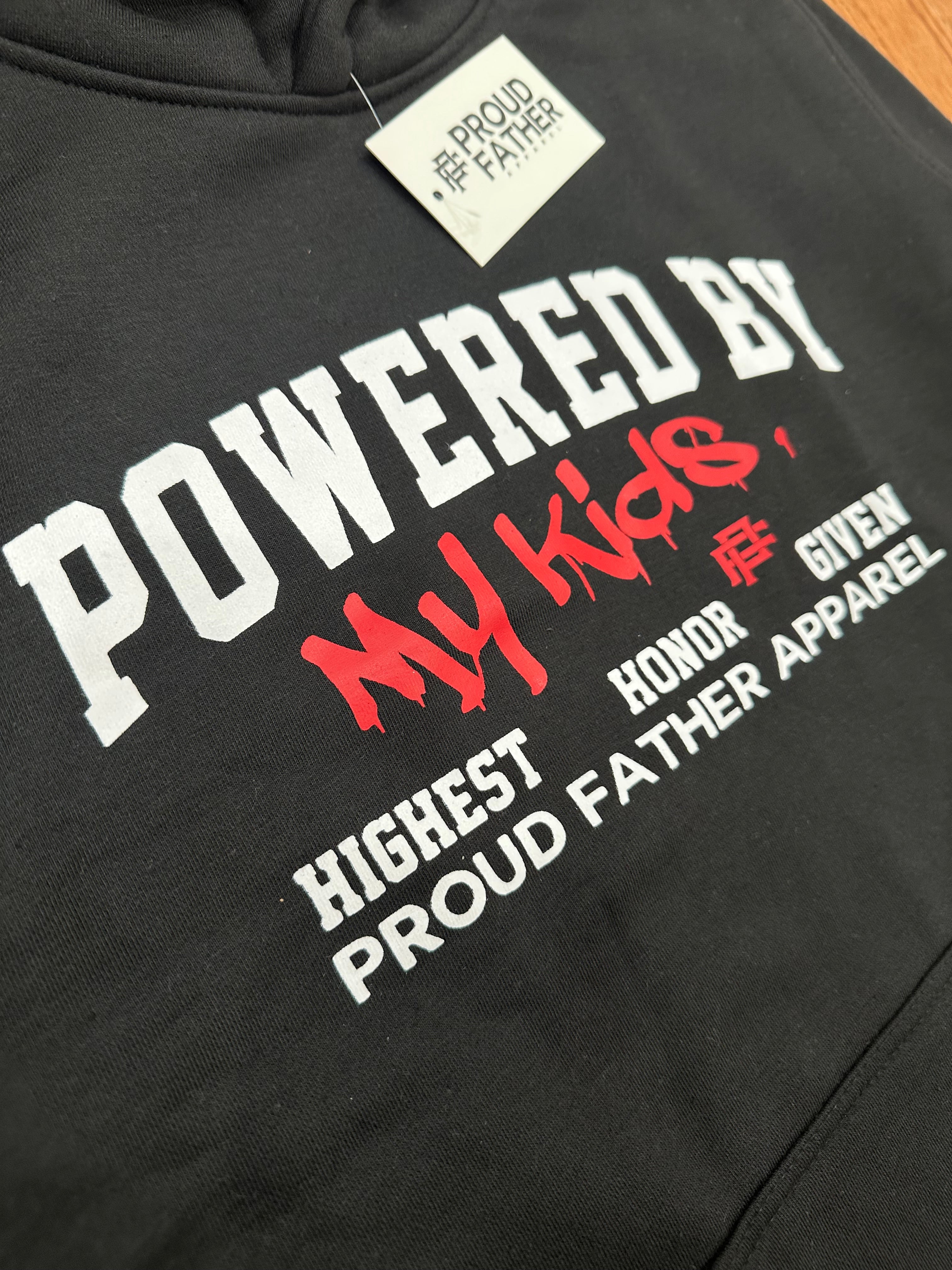 Front and center, “Powered By My Kids” stands bold and unapologetic. A statement every real dad can feel in his bones. On the right sleeve, the PF embroidered monogram marks the legacy: Proud Father — Highest Honor Given.